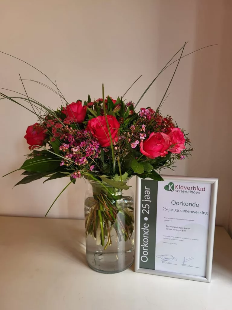 Vanmorgen werden wij verrast door onze accountmanager van Klaverblad Verzekeringen met een prachtige bos bloemen en een oorkonde ter ere van de 25-jarige samenwerking met Klaverblad. Een bijzonder en waardevol gebaar waar we enorm trots op zijn. We kijken met veel plezier terug op de afgelopen jaren en hopen deze mooie samenwerking nog vele jaren voort te zetten!